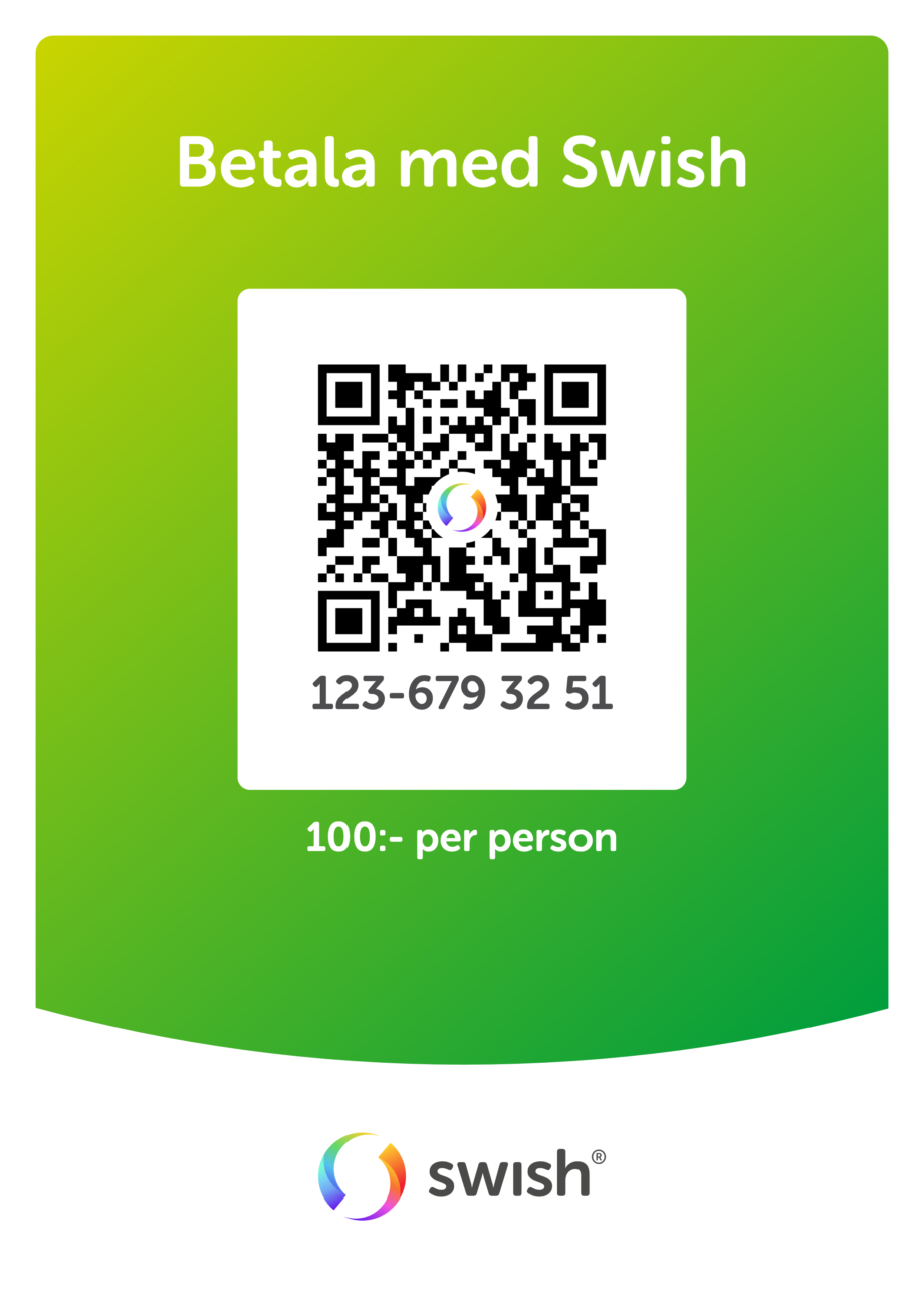 100 kr/person som betalas via Swish 123 679 3251 eller till Bankgiro 5271-9960 senast 28 februari. Glöm ej avsändare!
